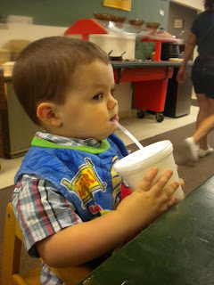 Sawyer is growing into such a wonderful big boy. Of course, he will always be Mama's "baby", but he is growing and doing new things every day! One of his new things is he loves drinking through a straw! I know it seems simple, but its a big accomplishment for us! Now if we forget the sippy cup at home, its not the end of the world! We can just order a drink with a straw! Yay!